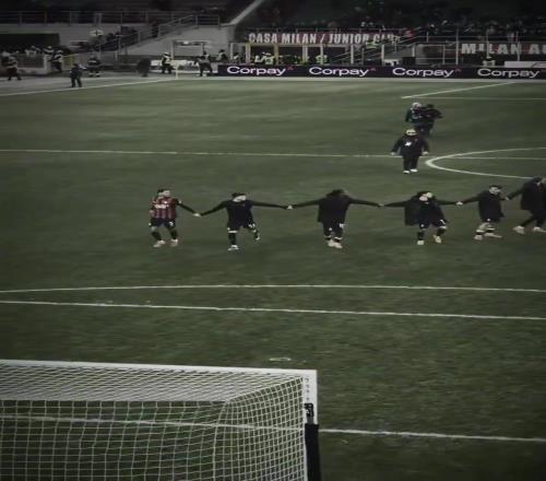米兰球员手拉手跑到一半停下,落在最后的萨勒马科尔斯腿上绑着冰袋,他一瘸一拐的赶上来还跳到了迈尼昂的背上。