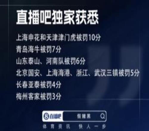 直播吧独家:海牛被罚7分河南泰山被罚6分浙江国安海港被罚5分